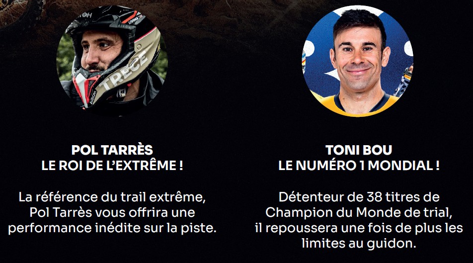 Lors de ce show inédit, des grosses figures de l'univers moto-cross enchaîneront figures techniques et franchissements impressionnants au guidon de leurs motos trail, sur un parcours spécialement conçu pour repousser les limites de la discipline.